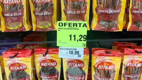 Conforme o relato, ao comprar temperos, ele notou que o preço indicado como promocional estava acima do valor anterior exibido na etiqueta comum. Um dos exemplos citados foi a pimenta-do-reino em pó da marca Kitano, que anteriormente era vendida por R$ 10,99, enquanto a “promoção” de final de semana indicava o valor de R$ 11,29.