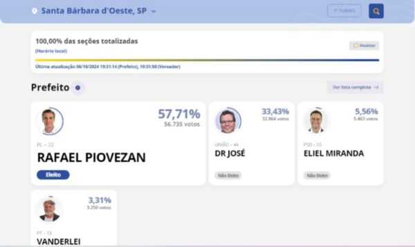 Com 98,73% das urnas apuradas, o atual prefeito e candidato à reeleição Rafael Piovezan (PL) é tido reeleito, com 57,71%, o equivalente a 56.735 votos, e se preserva no comando do Executivo por mais 4 anos.